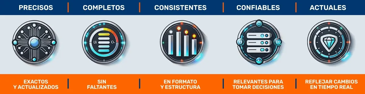 La data de calidad en logística se refieren a la información precisa, completa, consistente, confiable y actual, sobre pedidos (número de pedido, fecha de entrega, dirección de entrega), los datos del transporte (tipo de vehículo, capacidad de carga, placas, datos del operador), datos de rastreo y seguimiento (ubicación en tiempo real, estado de la mercancía, fecha y hora estimada de entrega), información de costos (de transporte, almacenamiento o manejo), datos de satisfacción del cliente (nivel de satisfacción, calidad del servicio), entre otros.